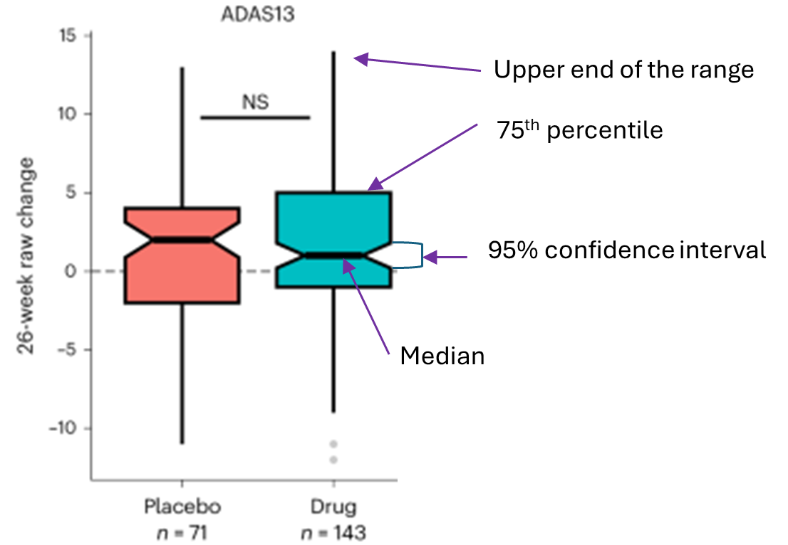 - The “raw” change (vertical axis label) means that the scores were not adjusted for potentially confounding factors. Such adjustment of efficacy results is routine in trials designed to assess efficacy, but not in this trial, which was designed to assess safety and tolerability.