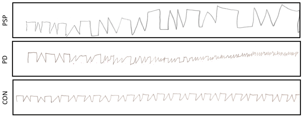 Meanwhile, I saw a cool paper in a journal called Sensors. Paula Stępień, a biomedical engineer at Silesian University and colleagues from multiple other institutions in Poland created an app that analyzes a commonly used, pen-and-paper neuropsychological test called the Luria Alternating Series Test. The examiner draws a series of connected triangles (actually inverted V’s) and squares (without the bottom side) an inch or two at the left of a sheet of paper. The patient then has to continue the series the rest of the way. Here are examples for someone with PSP (top), PD (middle) and a healthy control. The examiner’s model is the first five figures on the left of each line: