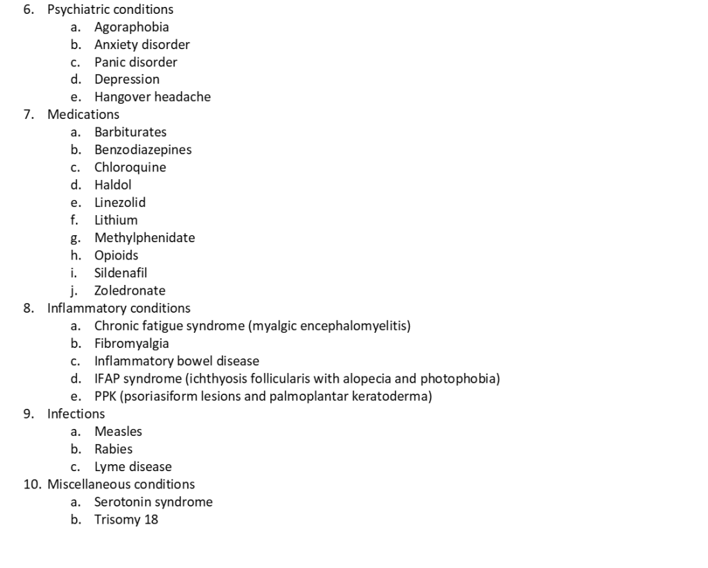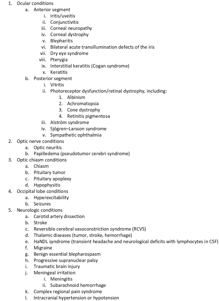 This list is adapted from: Buchanan TM, Digre KB, Warner JEA, Katz BJ. The unmet challenge of diagnosing and treating photophobia. Journal of Neuro-Ophthalmology: 3/25/2022. 10.1097/WNO.0000000000001556