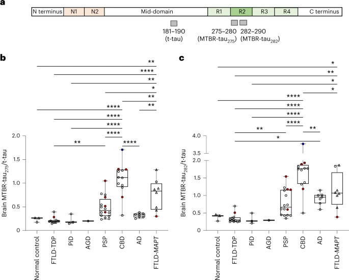 Panel “b” shows the analysis of the 275-280 fragment of tau in the spinal fluid (CSF). The vertical axis is the ratio of the concentration of the 275-280 fragment divided by the concentration of total tau. The horizontal axis lists the tauopathies analyzed in this project. Each circle is one patient. The “box-and-whisker” plot shows, from top to bottom, the maximum value, the 75th percentile, the median, the 25th percentile, and the minimum value. The asterisks indicate the statistical significance of the comparison between the two groups at the ends of each horizontal line segment. One asterisk is a weak difference and four is the strongest. Pairs of groups without a horizontal line connecting them did not differ (i.e. the p value was greater than 0.05, meaning that any difference between them could have occurred by chance with a likelihood of more than 1 in 20).