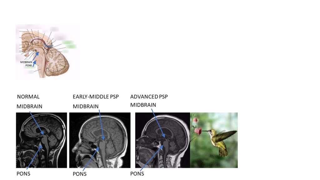 My re-emergent thought is about the famous “hummingbird sign.” On an MRI scan in the sagittal plane – that’s as if you sliced someone down the middle and looked at the cut surface – the brainstem sort of looks like a side view of a hummingbird.