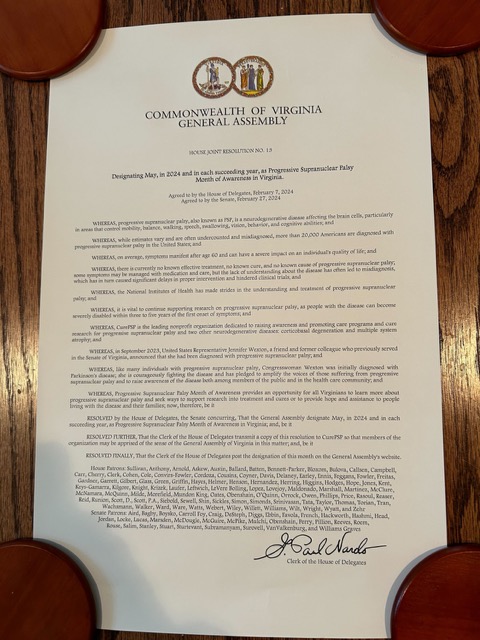The state of Virginia has just enacted a law declaring each May “PSP Month of Awareness.” Former Virginia State Senator and current US Representative Jennifer Wexton announced her diagnosis of PSP in September 2023 and has been working to help spread much-needed public awareness of the disorder. She still has many friends in the state legislature who stepped up to the plate for her and the approximately 20,000 others in the US with PSP.