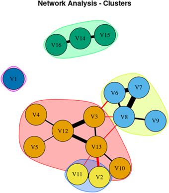 Here’s a graphical representation of the results. The features represented by the circles in each group interact with one another in a mutually reinforcing (the black bars) or interfering (the red bars) way. The thickness of the bars represents the strength of the interaction. An explanation in the researchers’ own words follows: