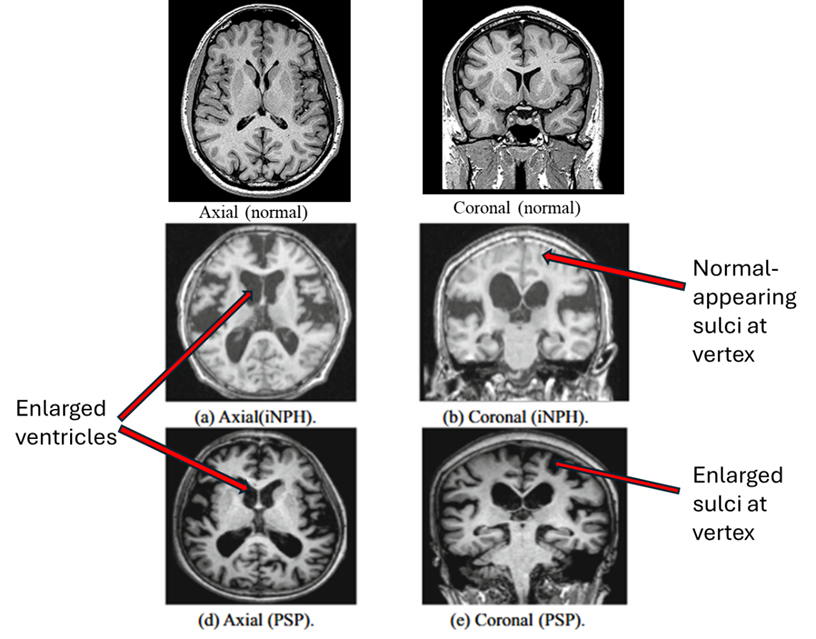A. MRI diagnosis. Below are MRI images from idiopathic NPH (middle row) and PSP (bottom row). The main differences between PSP and NPH are indicated by the labels on the right. PSP features widening of the spaces between the brain’s folds caused by atrophy of the brain tissue. But in NPH, the spaces toward the top of the brain are as tight as, or tighter than, normal. There are other, less reliable, MRI differences, none of them adequately sensitive or specific for NPH.