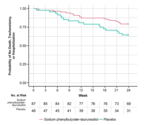 The graph below (also from Paganoni et al), called a Kaplan-Meier survival plot, shows the fraction of patients in the ALS trial remaining alive without tracheostomy or hospitalization (vertical axis) along the 24 weeks of the trial (horizontal axis).