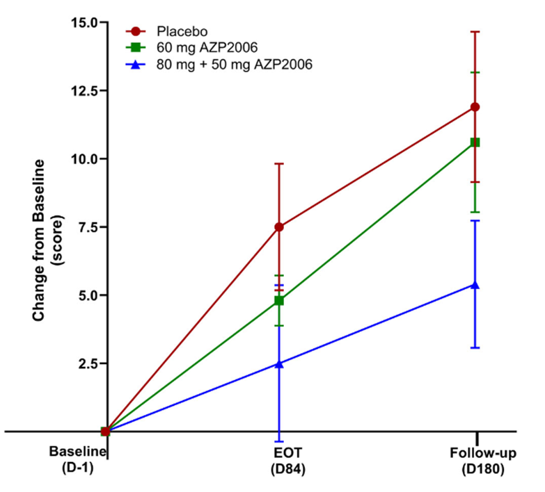 In this graph, the vertical axis is the worsening in terms of the 100-point PSP Rating Scale. EOT is end of the double-blind part of the trial at Day 84. Thereafter, all participants received active AZP-2006. Note that both active-drug groups progressed more slowly than the placebo group over the first 3 months; and on active drug, the participants formerly on placebo may have slowed their progression rate. The vertical line segments represent standard deviations of the mean. (From: Corvol JC, Obadia MA, Moreau C, et al. AZP2006 in progressive supranuclear palsy: outcomes from a Phase 2a multicenter, randomized trial, and open-label extension on safety, biomarkers, and disease progression. Movement Disorders. 2025 Sep 27. doi: 10.1002/mds.70049. PMID: 41014124)