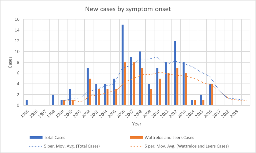 Graph showing the disappearance of cases with onset since 2016. Bars show the number of cases with onset in each year. Dotted lines show the average over the previous 5 years. “Total Cases” refers to all cases in Wattrelos and Leers as well as in nearby towns where patients were likely to use the Wattrelos hospital. The paucity of cases with onset before 2002 is explained by the arrival of Dr. Caparros in Wattrelos in 2005. Before that, no physician likely to have been able to diagnose PSP worked there and few patients with onset before 2002 would have survived to come to Dr. Caparros’ attention. Still, we cannot rule out the possibility that the cluster in fact started in the 1990s and its disappearance by 2017 is consistent with this possibility.