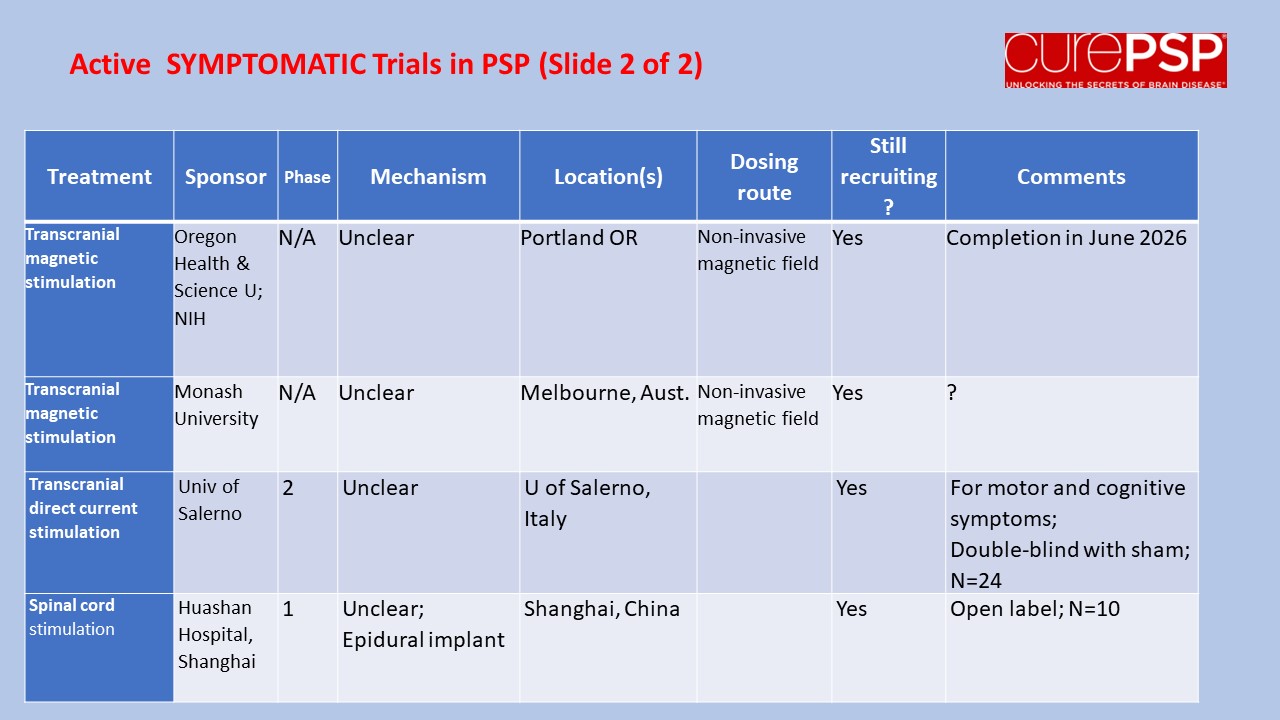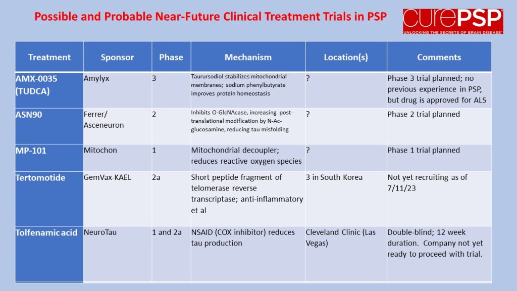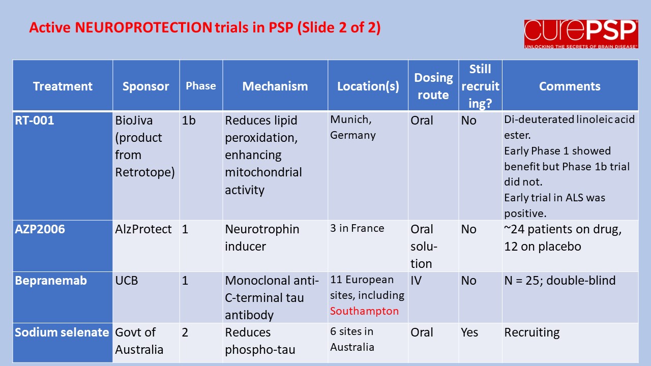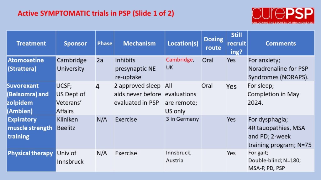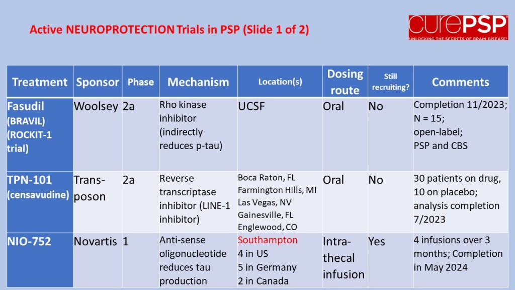 For current information on how to enroll, visit clinicaltrials.gov and search on the drug and/or sponsor and/or “progressive supranuclear palsy.”